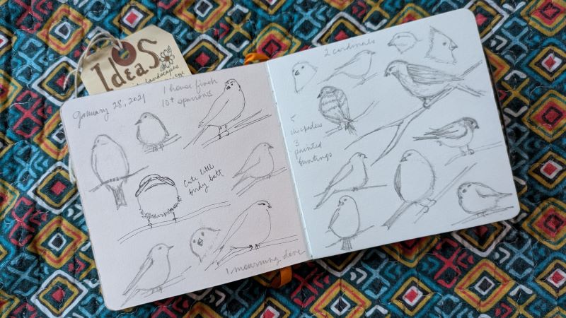 My condolence prize when I moved back on land in the winter of 2020 was a window with a view of two pairs of rare painted buntings. Jack built a feeder and attached it to the sill, and I sat still, silent, and sketching for hours on end in rapt joy as they argued and necked and trilled arias on that tiny wooden stage.
